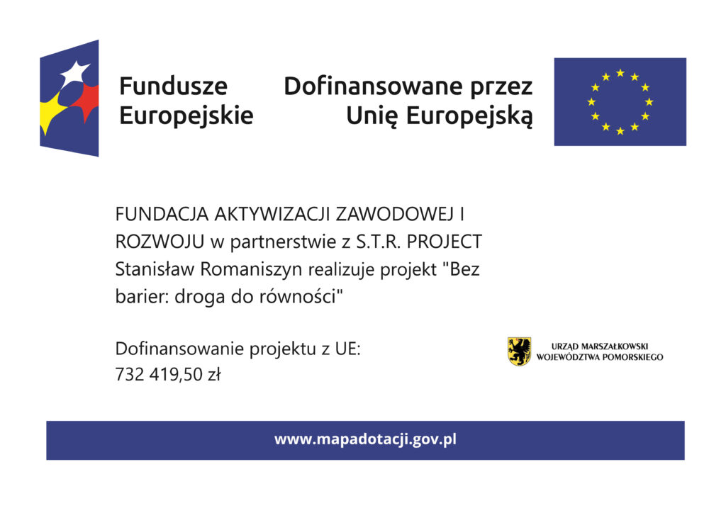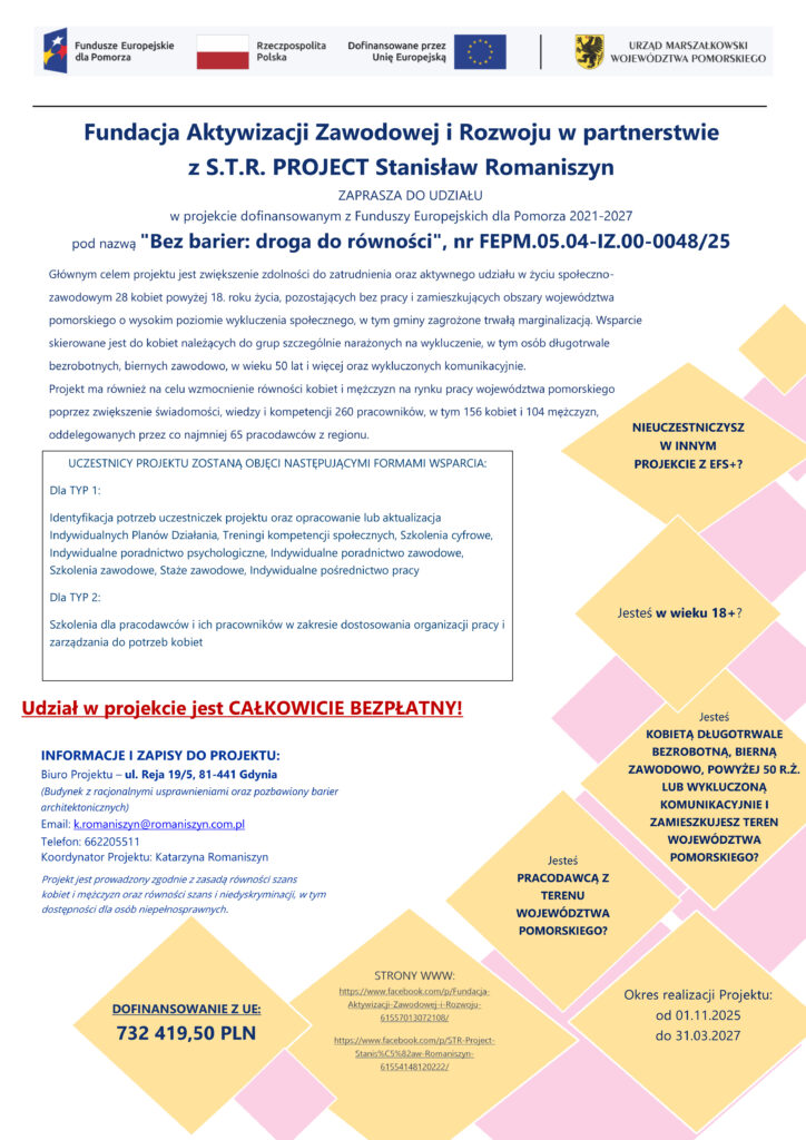 Fundacja Aktywizacji Zawodowej i Rozwoju w partnerstwie z S.T.R. PROJECT Stanisław Romaniszyn zapraszają do udziału w projekcie pt. „Bez barier: droga do równości”, nr FEPM.05.04-IZ.00-0048/25 realizowanym na obszarze województwa pomorskiego.